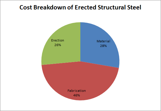 You can achieve further savings on a steel project by getting a steel fabricator involved early in the design phase. Most of the steel package's cost comes from fabrication and erection (often 70% or more; see Figure 1 below), and a knowledgeable, experienced fabricator can provide tips and advice on how to design and fabricate steel members and assemblies as efficiently as possible--e.g., eliminating doubler and stiffener plates in favor of heavier members or reducing the number of pieces to be fabricated in favor of different member sizes.