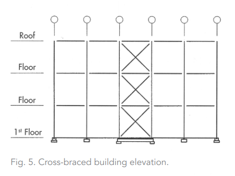 Figure 5 depicts a typical multi-floor building elevation with cross-braced bays beginning at the foundation level. While Figure 5 shows only one bay of bracing, the height and size of the specific structure may call for bracing multiple bays along a given column line. As with all braced-frame configurations, it's important to establish the location of these bays quite early in a project's development.