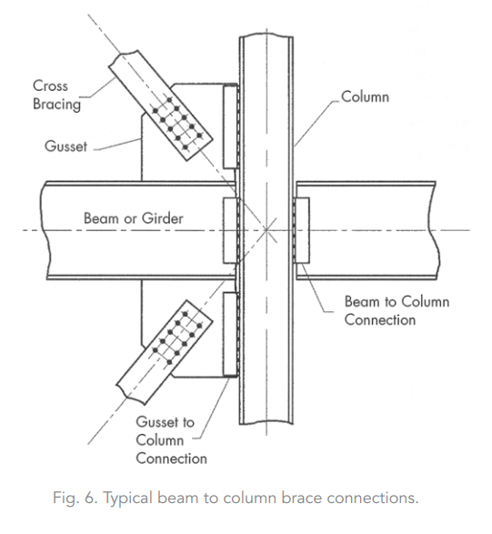 Each intersection will have a common "work point" at which the centerlines of a column, beams, and diagonal members intersect. Gusset plate connections are used to join the steel members because all of them can't physically intersect at the work point. Figure 6 illustrates a typical beam-to-column joint for a cross-braced frame.