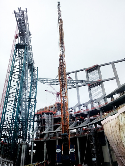 Construction of the new Minnesota Vikings Stadium in Minneapolis has reached halftime. Steel erection for the roof frame is expected to be finished by this fall and the stadium is on schedule to open in August 2016. The project’s steel team comprises AISC Member/Certified fabricator Lejeune Steel Company, Minneapolis, and AISC Member/Advanced Certified steel erector Danny Construction Company, Shakopee, Minn. Mortenson Construction, the project’s general contractor, says crews have erected about 5,000 of the 11,000 tons of steel that will be used for the roof, including five of the 11 queen post trusses that will span from the ridge truss to the ring beam on the east and west sides of the stadium. The ridge truss is close to completion, with two segments remaining to be linked to complete the span of about 1,000 ft. To follow news on the stadium’s construction progress, visit www.vikings.com/news/all-news/stadium.html. (Photos: Brad Lange, AISC's Midwest Business Development Representative)