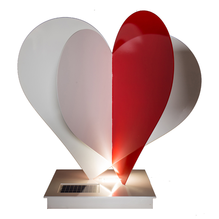 One of this year’s large heart sculptures was created by builder, fabricator and maker, Matthew Mackie Pigman with his local studio, Mackie Builder. His sculpture, entitled “Everett’s Heart Planes,” is made of one ton of sand-blasted, powder-coated plate steel and is illuminated with solar-powered light; it stands 5 ft tall and is 5 ft, 9 in. wide. The heart was created to honor the medical community and Matthew’s son, Everett. Matthew built the heart, made from heavy steel, as a representation of the strength and beauty of his son and the heroes that helped him fight to stay alive.