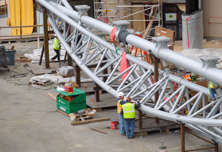 Architect Devenney Group answered with a “spire,” an abstract steel assembly representing a strong man holding a tall flag. The spire’s installation was the last main element of the project to be completed prior to the hospital opening — the cherry on top, or rather on the side of the building, if you will. Stakes and expectations were very high for successful and on-time design and delivery of the spire, and it required extensive and continuous collaboration between the owner, architect, structural engineers, general contractor and the steel team.