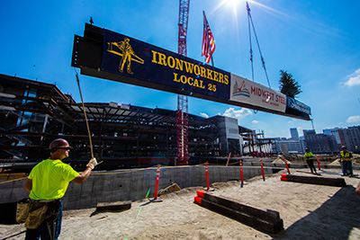 The final piece of structural steel was recently placed on the roof of Detroit’s new Little Caesars Arena (future home of the Detroit Red Wings) and commemorated with a traditional topping out ceremony during which ironworkers signed their names and attached banners, an American flag and an evergreen tree before it was hoisted into place.