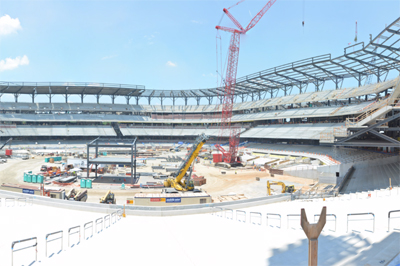 The 33-ft-long beam, which also had an American flag and a tree mounted on it — an American Ironworkers tradition dating back to the 1930s — was placed 155 ft above the park’s yet-to-be completed playing surface, putting a cap on the approximately 6,800 tons of steel used on the project. Laid end-to-end, the steel would stretch for 50 miles. Hirschfeld Industries (an AISC Member and Certified fabricator) is the project’s steel fabricator.