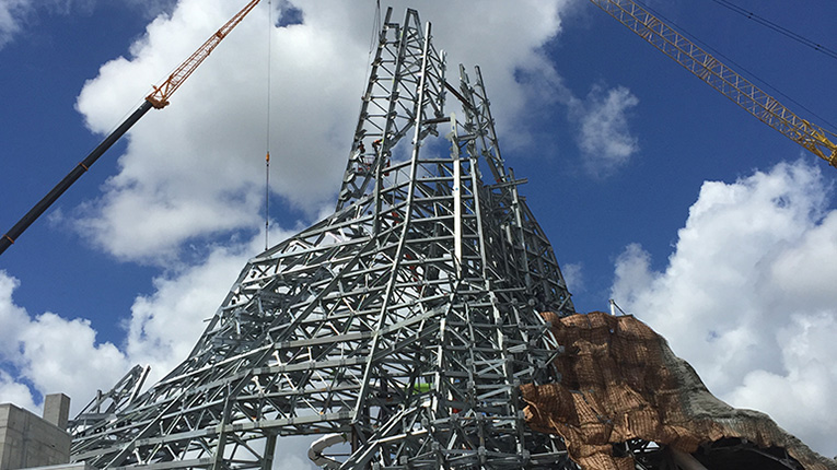 Designed by structural engineer GRAEF and fabricated by Fabco Metal Products (an AISC member and certified fabricator) — and filled with waterslides, not lava tubes — the 200-ft-tall volcano is formed with space frames consisting of a series of vertical bent trusses that rotate around multiple vertical axes. These trusses span various lengths and are interlaced with secondary framing to support multiple platforms. To maintain consistency, all of the members were W14 shapes, ranging from W14×30 to W14×398.