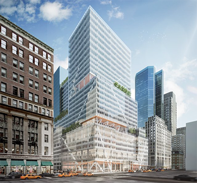 At 390 Madison Avenue in New York City, a 1950s era office building is being reconceived from the inside out -- in steel -- with new column-free spans and a new facade. The building is essentially being torn down to its steel core and built back up, but this time with higher ceilings and functional outdoor space. Owen Steel Company (an AISC member and certified fabricator) is the steel fabricator for the project.