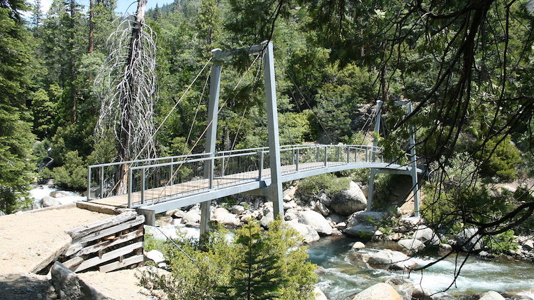 This hiker's bridge is part of an extensive network of trail systems in the Sierra National Forest and crosses the North Fork of the San Joaquin River. In a highly sensitive environment, the appearance of the bridge could not interfere with the scenic surroundings or cause construction disturbances to the site. Thus, the designers created a lightweight steel-stayed suspension bridge, shop fabricated and helicoptered to the site in sections with field-bolted connections. To minimize future maintenance, all metal was hot-dip galvanized. The timber-decked, lightweight, thin superstructure adds excitement for those who cross.