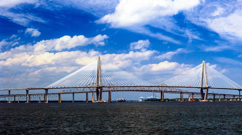 The dramatic Cooper River Bridge—one of the longest cable-stayed bridges in North America—opened in July 2005 a year ahead of schedule, saving the South Carolina Department of Transportation (SCDOT) an estimated $150 million. A week of festivities, including a fireworks display, an on-deck performance by the Charleston Symphony Orchestra, and a walk across the bridge by more than 100,000 people, celebrated this bridge dedicated to South Carolina State Senator Arthur Ravenel, Jr.