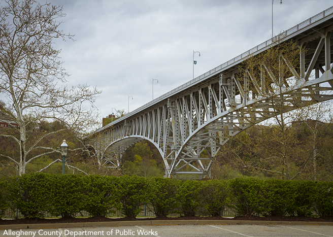 Opened in 1937, this impressive steel superstructure, originally known as the Homestead High-Level Bridge, was designed by Allegheny County with George S. Richardson as chief engineer. American Bridge Company constructed it. The total length of the bridge is approximately 3,100 ft, and it was designed to carry four traffic lanes and a pedestrian walkway on each side. Additionally, the bridge was designed to carry trolley traffic on rails placed in the center two lanes.