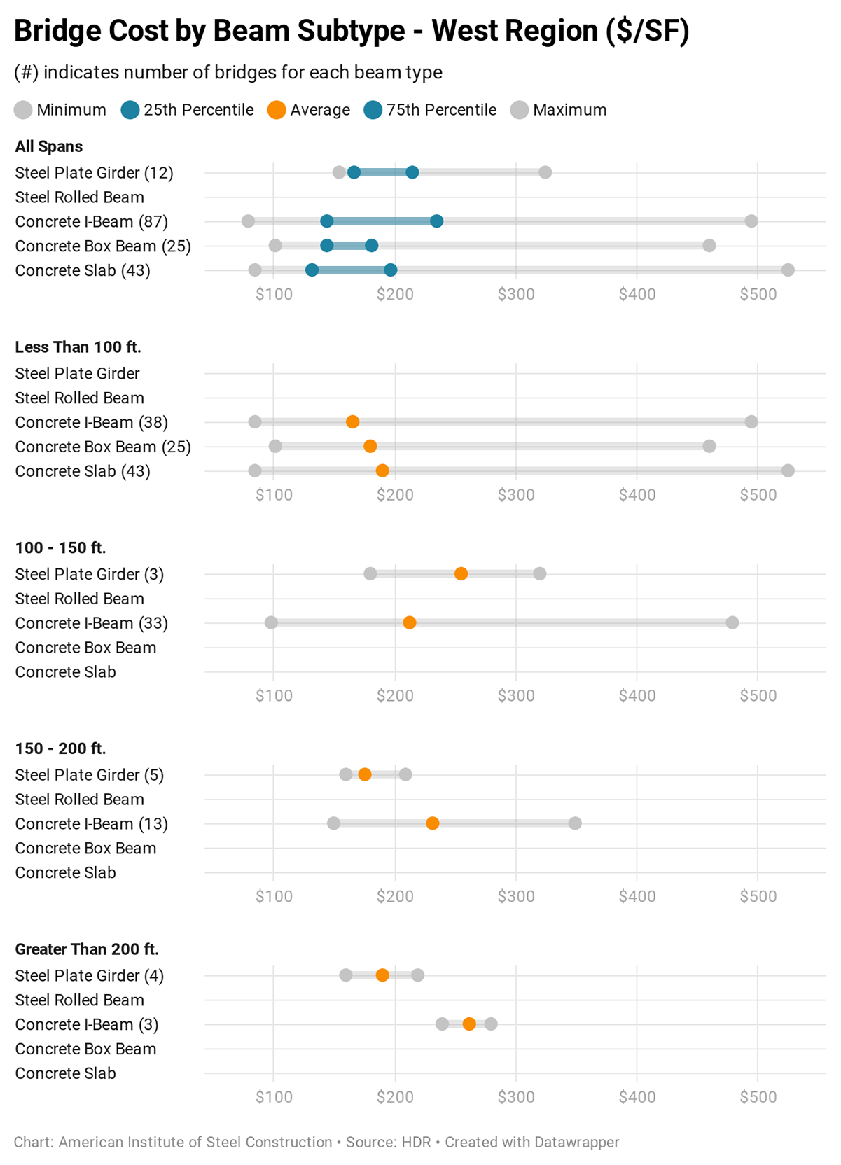 Note the tight distribution of steel plate girder bridge costs. This type of steel bridge generally sees significantly less variation in pricing than concrete I-beam bridges.