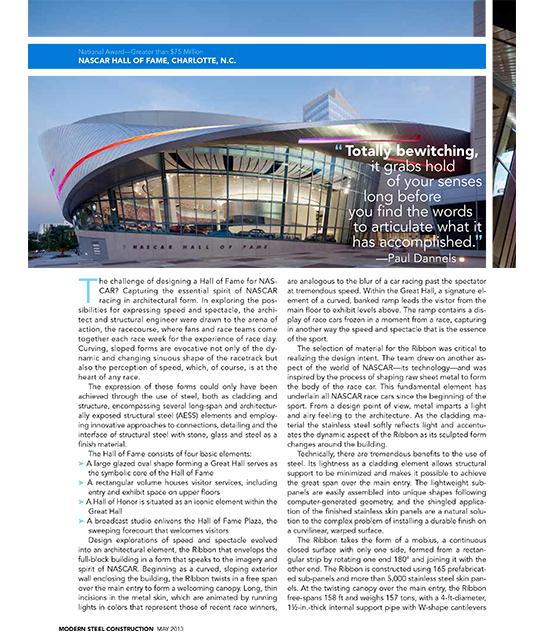In 2013, AISC honored Pei's NASCAR Hall of Fame in Charlotte, N.C., with an Innovative Design in Engineering and Architecture with Structural Steel (IDEAS2) award. A sinuous steel ribbon with inset running lights envelops the exterior of the building, evoking the speed, spectacle, and spirit of NASCAR. More details about this building's remarkable achievements in both architecture and engineering can be found in the May 2013 issue of Modern Steel Construction magazine.