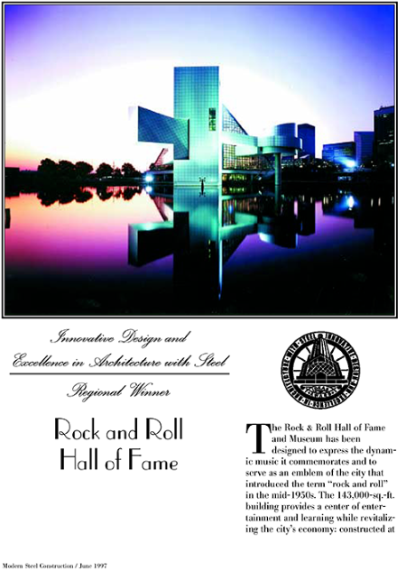 The landmark Rock and Roll Hall of Fame in Cleveland also won AISC awards in 1997 for innovative design and architectural excellence as well as excellence in engineering. The building's geometric composition mimics the rhythm of the dynamic music it honors.
