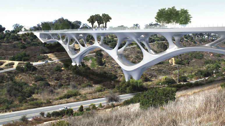 Ruthrauff’s design, conceived for a site in San Diego’s Balboa Park, draws on Spanish-inspired architecture in the Prado, local flora, and the nearby Cabrillo Bridge. The bridge’s organic form reflects the network of trails in Florida Canyon.