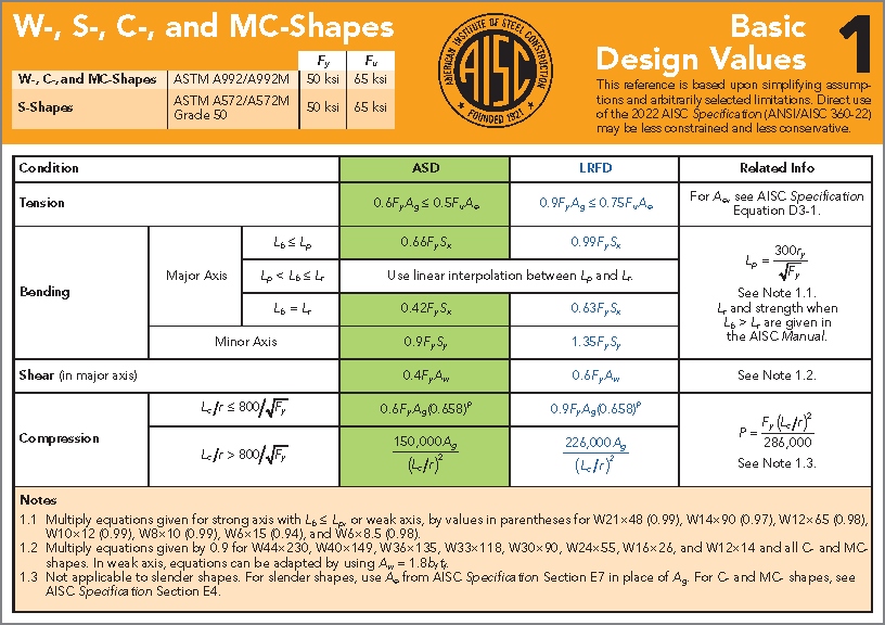 The Basic Design Value Cards are a design aid for the 2022 AISC Specification for Structural Steel Buildings (ANSI/AISC 360-22). These cards present some of the most frequently used equations from the Specification in a simplified and abbreviated format.